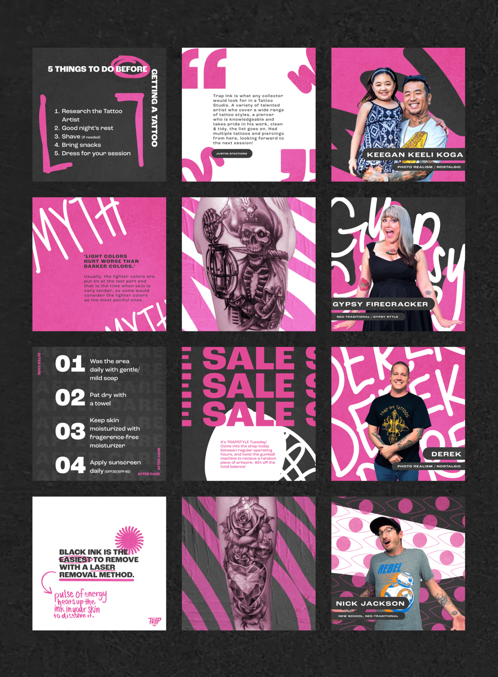Trap Ink is a friendly tattoo shop located in Bradenton, Florida. This shop is perfect for first-timers or people who want to make a permanent change to their appearance 'on-the-fly'. I teamed up with Trap Ink to refresh their brand; digitally.